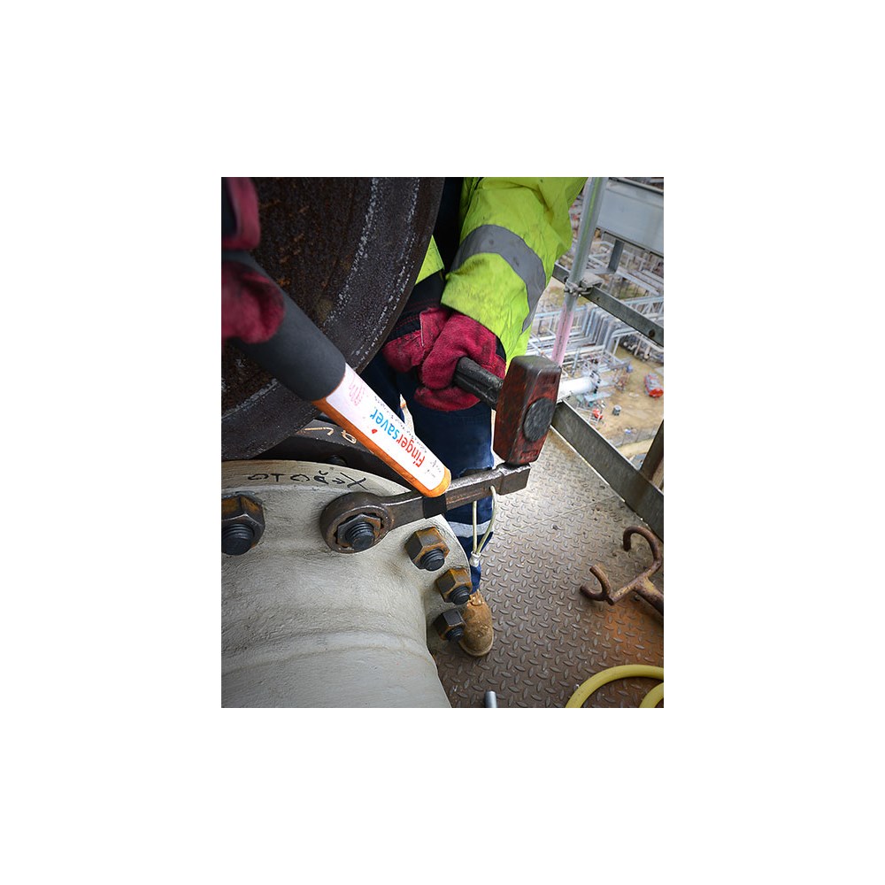 Fingerbeskytteren kan redusere faren for skader på hender og fingre når man arbeider med slagverktøy som f.eks. slagringnøkler. Fingerbeskytterens løkke tres rundt f.eks. slagringnøkkelen og strammes til. Se illustrasjonsbildene.