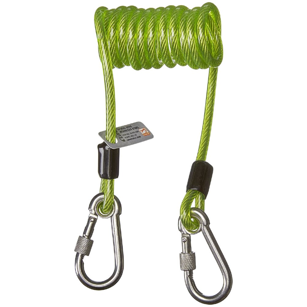 Spiralwire av rustfritt rustfritt stål (AISI 304) med plastbeskyttelse, karabinkroker i rustfritt stål (AISI 304) med skrulås.