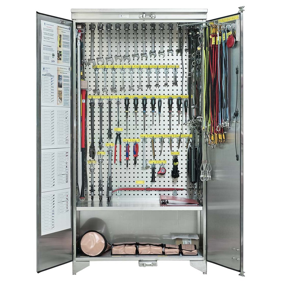 Verktøyskap i syrefast stål med verktøy og utstyr for arbeid i høyden