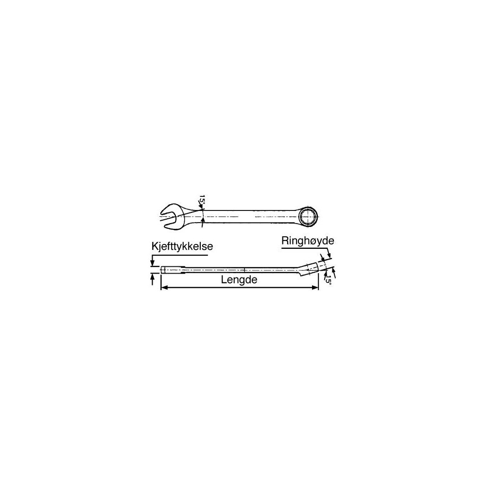 Tynne og sterke kombinasjonsnøkler i millimeterstørrelser. Av kromvanadiumstål. Laget iht. DIN 3113A - ISO 3318 - ISO 7738. Samme dimensjon i begge ender. Det tolvkantede ringhodet er bukket i 15° vinkel. Slipte hoder. Mattforkrommet.