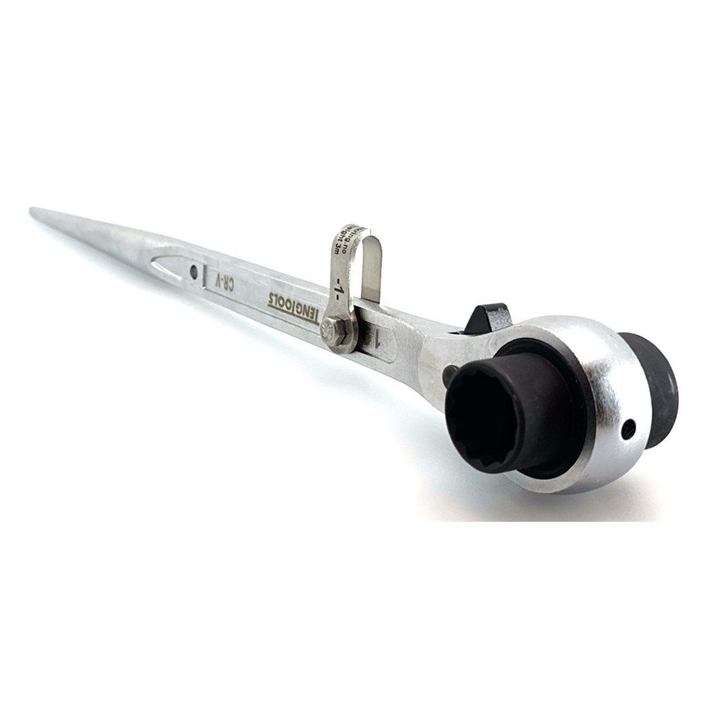 Skrallenøkler i kromvanadiumstål for arbeider med f.eks. byggstillaser. To størrelser i hver nøkkel, 12-kant ringskralle med 32 tenner.