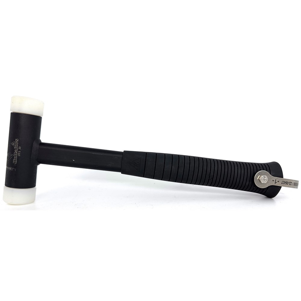 Hammer med slaghode av stål som er fylt med stålkuler. Skallen har utskiftbare slag av nylon med hardhet 70 shore som er skånsomme mot arbeidsstykket. Stålskaft med gummihåndtak av Santopren.